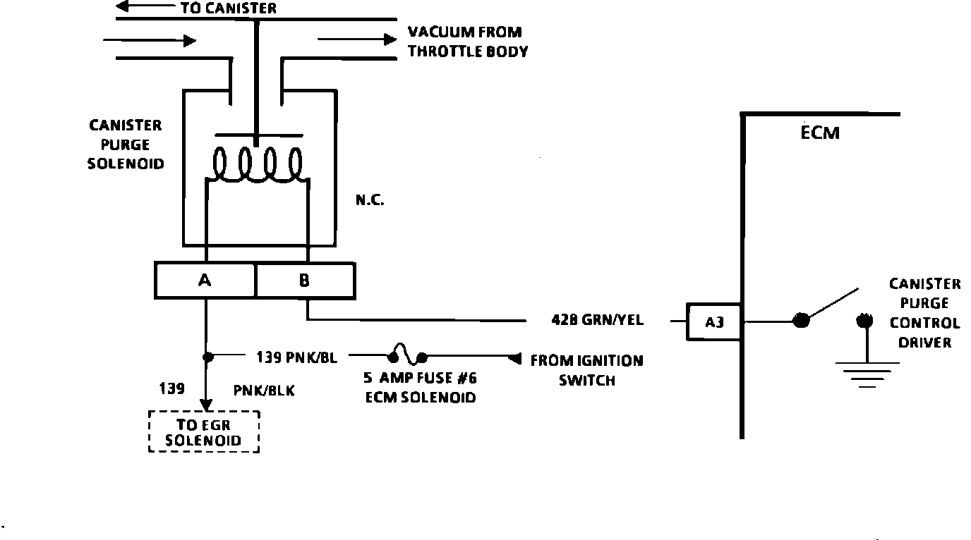 Canister purge is controlled by a normally closed solenoid that allows throttle body vacuum to purge the canister vapors when energized. Ignition supply voltage is applied to solenoid terminal "A" through CKT 139 and the ECM completes the circuit to ground through CKT 428 to energize the solenoid (purge "ON").