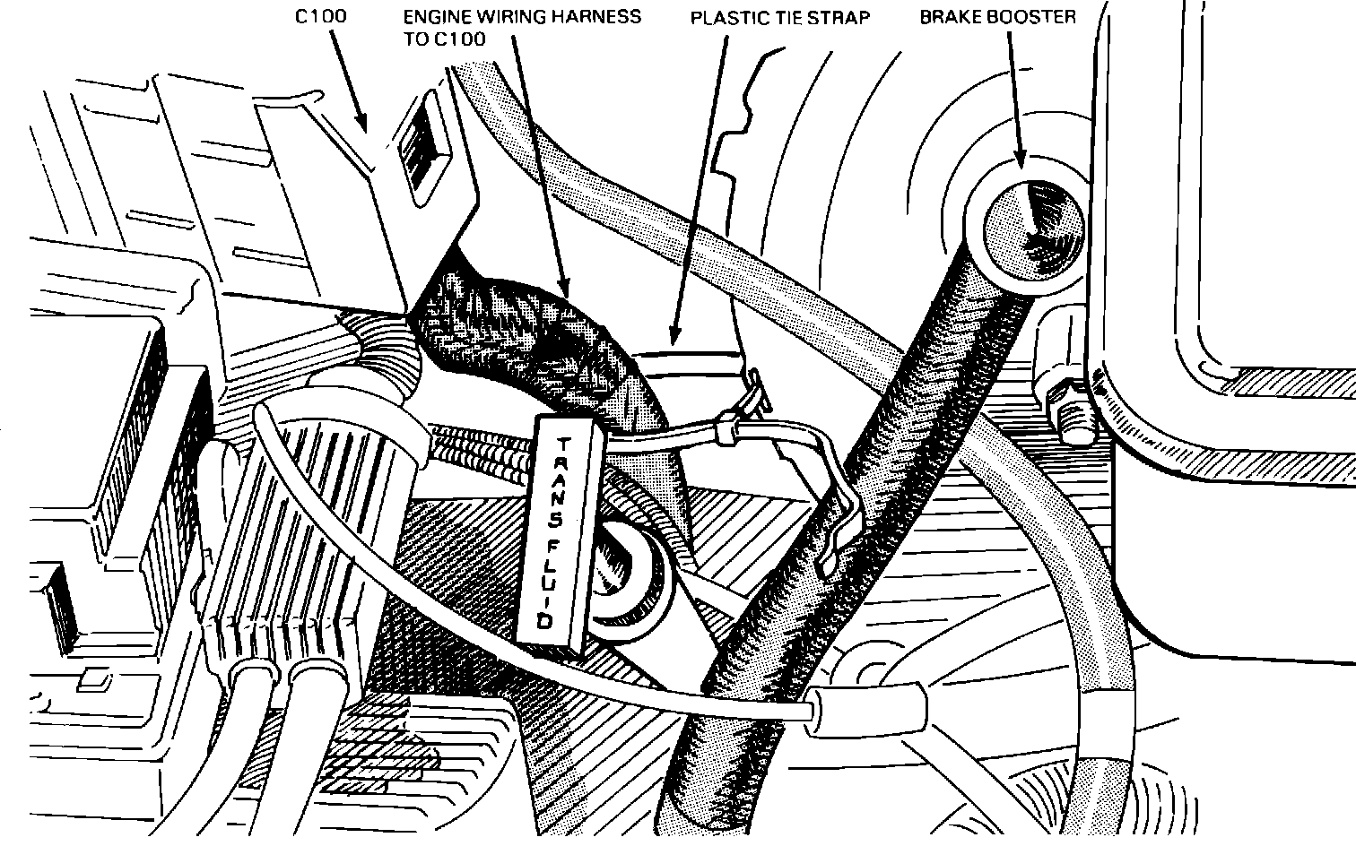 If chafing or abrasion is found in the area of the exhaust heat shield, Part Number 8877974, tie strap, should be used to tie the harness to the brake booster (see illustration) to provide more clearance between the harness and heat shield.
