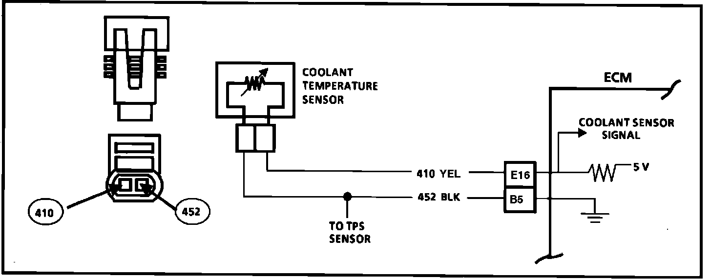 Circuit Description: The Coolant Temperature Sensor uses a thermistor to control the signal voltage to the ECM. The ECM applies a voltage on CKT 410 to the sensor. When the engine is cold, the sensor (thermistor) resistance is high, so the ECM sees high signal voltage.