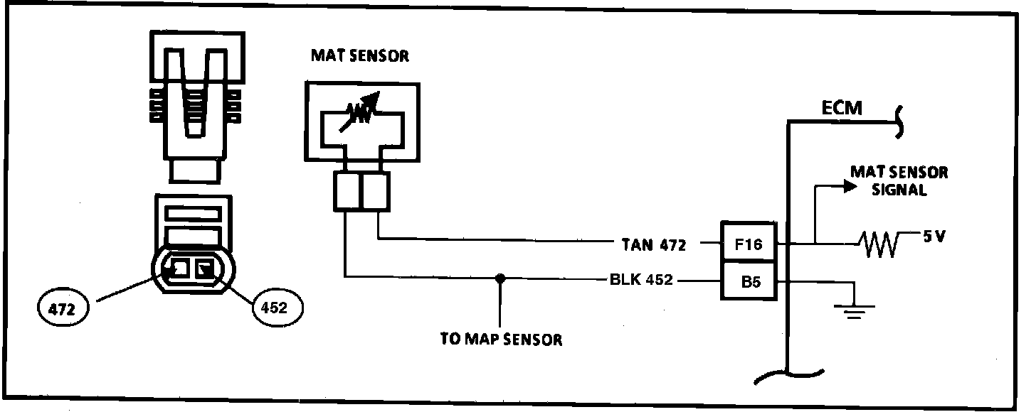 Circuit Description: The Manifold Air Temperature Sensor uses a thermistor to control the signal voltage to the ECM. The ECM applies a voltage (4-6 volts) on CKT 472 to the sensor. When manifold air is cold, the sensor (thermistor) resistance is high, so the ECM sees a high signal voltage. As the air warms, the sensor resistance becomes less and the voltage drops.