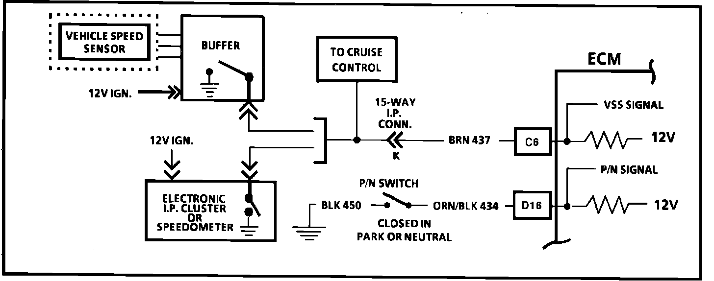 Circuit Description: The ECM applies and monitors 12 volts on CKT 437. CKT 437 connects to the Vehicle Speed Sensor which alternately grounds CKT 437 when drive wheel are turning. This pulsing action takes place about 2000 times per mile and the ECM will calculate vehicle speed based on the time between "pulses".
