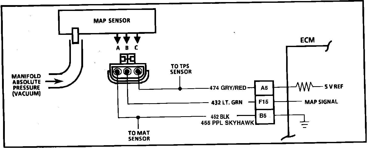Circuit Description: The Manifold Absolute Pressure Sensor (MAP) responds to changes in manifold pressure (vacuum). The ECM receives this information as a signal voltage that will vary from about 1 to 1.5 volts, at closed throttle idle, to 4 4.5 volts at wide open throttle (low vacuum).