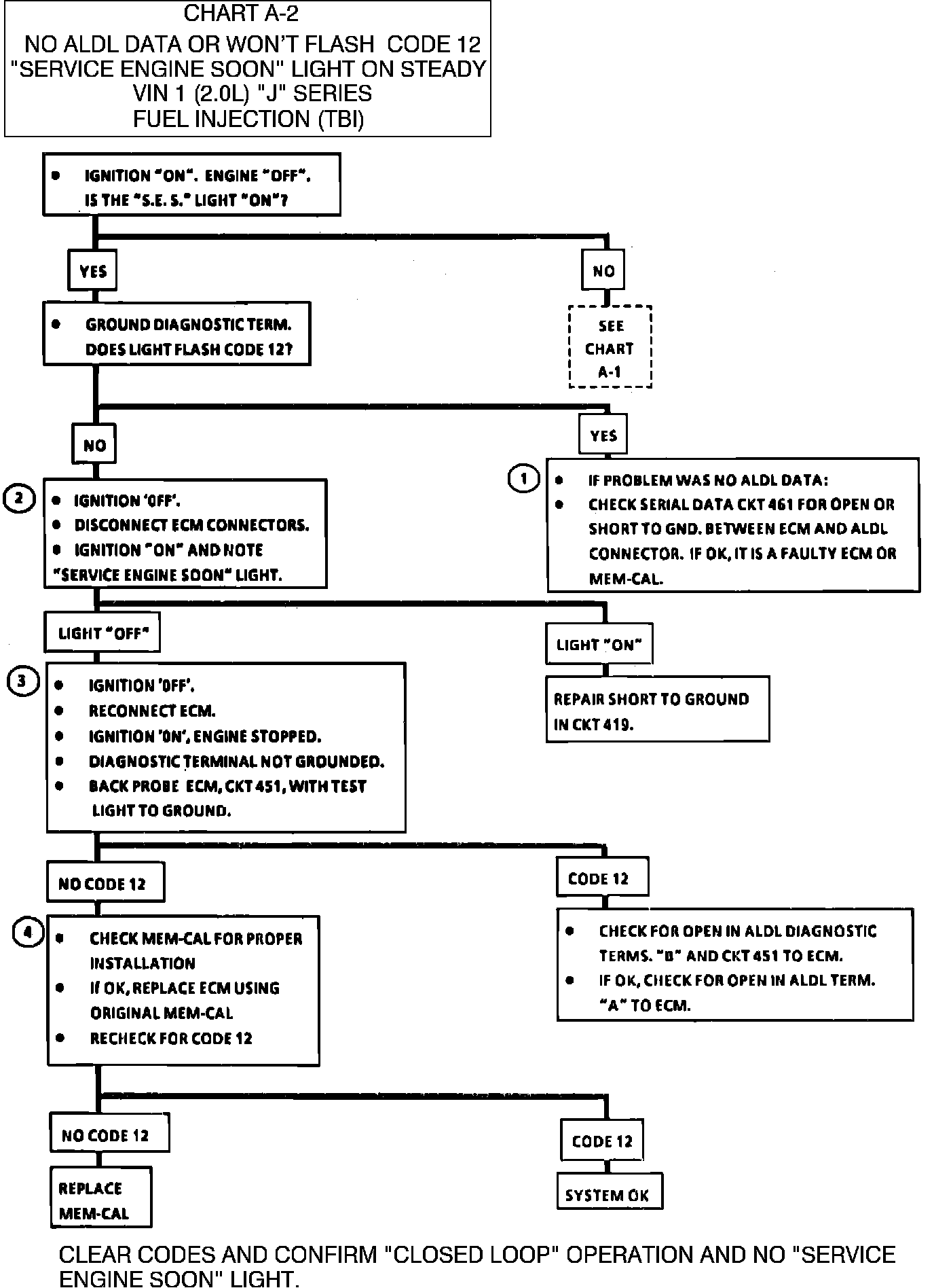 1. If there is a problem with the ECM that causes a "Scan" tool to not read Serial data, then the ECM should not flash a Code 12. If Code 12 does flash, be sure the "Scan" tool is working properly on another vehicle. If the "Scan" is functioning properly and CKT 461 is OK, the Mem-Cal or ECM may be at fault for the NO ALDL symptom.
