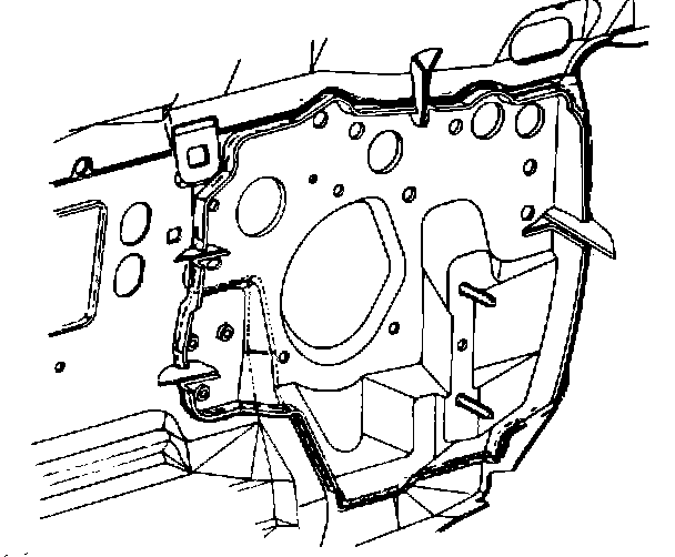 The following illustrations indicate the sealed areas of the front body portion of the vehicle. When a water leak is experienced in the front cowl area, inspect the seams for proper sealing. Should it be necessary to reseal an area, a high quality medium bodied sealer which will remain flexible after curing such as 3M Flexiclear, Part Number 08405 or equivalent, should be applied.