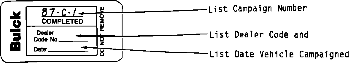 Install a Campaign Identification Label. Each vehicle modified in accordance with the instructions outlined in this procedure will require a Campaign Identification Label. Each label provides a space to include the campaign number, the five (5) digit dealer code of the dealer performing the campaign service, and the date vehicle was campaigned. This information may be inserted with a typewriter or ballpoint pen. When installing label, clean and dry the surface of the radiator upper mounting support and apply the campaign label where it is readily visible.