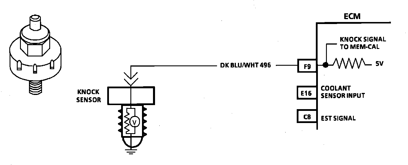 The knock sensor is used to detect engine detonation and the ECM will retard the electronic spark timing based on the signal being received. The circuitry, within the knock sensor, causes the ECM's 5 volts to be pulled down so that under a no knock condition, CKT 496 would measure about 2.5 volts. The knock sensor produces an AC signal, which rides on the 2.5 volts DC voltage. The amplitude and frequency are dependent upon the knock level. The Mem-Cal, used with this engine, contains the functions which were part of remotely mounted ESC modules used on other GM vehicles. The ESC portion of the Mem-Cal sends a signal to other parts of the ECM which adjusts the spark timing to retard the spark and reduce the detonation.