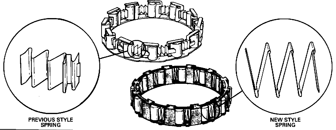 A new Roller Clutch for all Hydra-Matic 3T40 transaxles, for increased Lo Roller clutch durability. This new roller clutch has a new spring and roller holding cage which is plastic and black in color. The springs located inside the roller clutch have been rotated to a position of 90 degrees. (Figures 1 and 2)