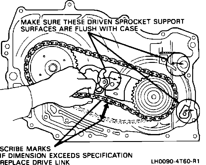 The drive link wear specification has been changed to minimize noise. The previous specification for the Hydra-Matic 3T40 (THM 125C) was 27.4 mm (1-1/16 in.). The new specification is 22.2 mm (7/8 in.). The specification for the Hydra-Matic 4T60 (THM 440T4) is 27.4 mm (1-1/16 in.).