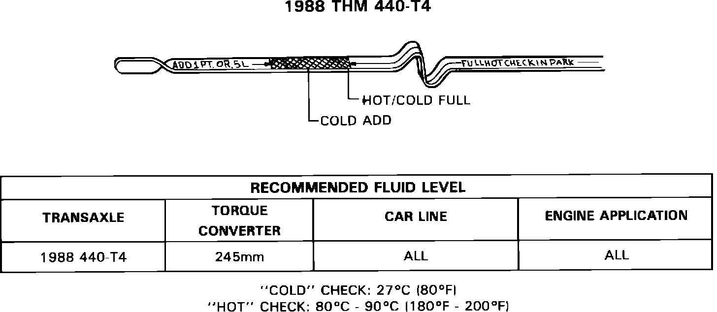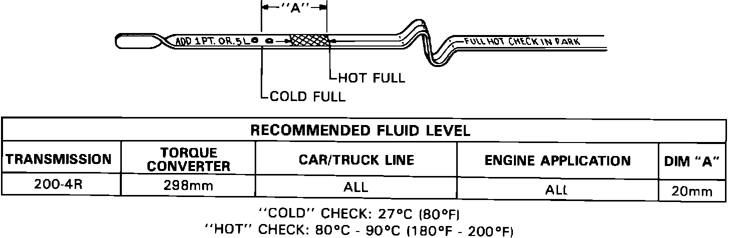 When cold, 27~C (80~F), a full THM 200-4R transmission will show the fluid level to be below the "Add" mark on the fluid level indicator (refer to Figure 1). As the transmission warms to normal operating temperature, the fluid expands raising the level to within the cross-hatched area on the fluid level indicator.