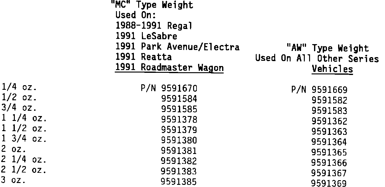 There are two types of coated wheel weights available to fit the GM vehicles (see illustration). Both types of weights are available from GMSPO in 1/4 ounce increments. See usage chart below to determine which type weight is correct for the vehicle.