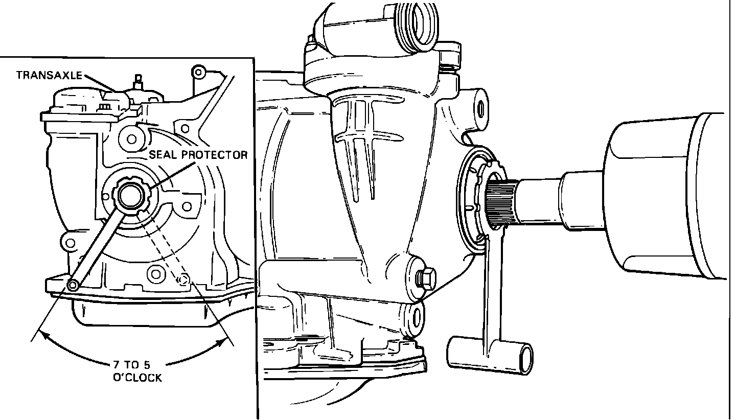 Once the transaxle is installed in the car and before the right side Drive Axle is installed, insert sleeve portion of Axle Seal Protector into the Axle Seal (Figure 2). Install with the "T-bar handle" in such a position so that it can be pulled out easily after the Drive Axle is installed. This will be between the 5 to 7 o'clock position, depending on the transaxle and carline. To remove the Axle Seal Protector after the Drive Axle is installed, pull in line with the "T-bar handle". Once removed, ensure that the Axle Seal Protector is intact (no pieces left inside the transaxle). Dispose of the protector, it is not reusable. Note - the Axle Seal should be replaced every time the Drive Axle is removed because the seal can be damaged during removal as well as installation.