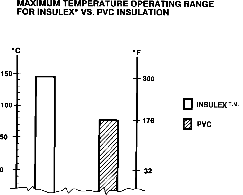 For wiring repairs in areas where temperatures exceed 80 degrees C (176 degrees F), a cable of sufficient size with a special thermo set compound is required. Cross link polythylene (Insulex (TM)) is such a material and should be used where temperatures exceed 80 degrees C (176 degrees F) such as the engine compartment, especially when the wiring harness is near the exhaust manifold or exhaust system. Cross link polythylene can withstand continuous operating temperatures of up to 148 degrees C (300 degrees F), see Fig. 1, and has 25% more resistance to abrasion and 10% more "pinch" protection than general purpose PVC cable insulation. Should a short occur, the cross link polythylene insulation will not burn.