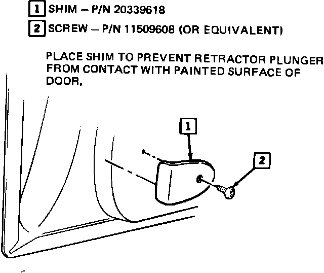 2. Install shim, Part Number 20339618, using screw, Part Number 11509608 or equivalent to door as shown in illustration. Parts are currently available from GMSPO.
