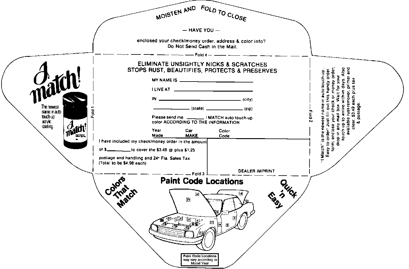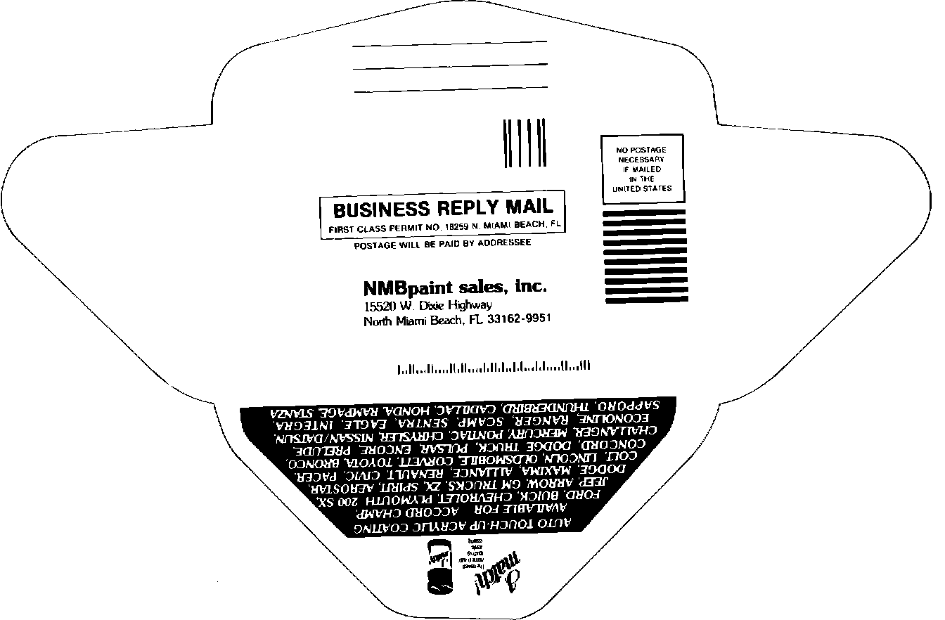 Pads of postage paid order forms (see attached sample) can be obtained from NMB Paint Sales at the address listed below. The dealer can supply these forms to the customer at new car delivery or anytime a customer requests touch up paint. The customer completes the order (imprinted with the dealer's address) and mails it with their check to NMB Paint Sales. The customer receives their paint directly from NMB and the dealer receives the profit (($1.04) per bottle) as a direct reimbursement.