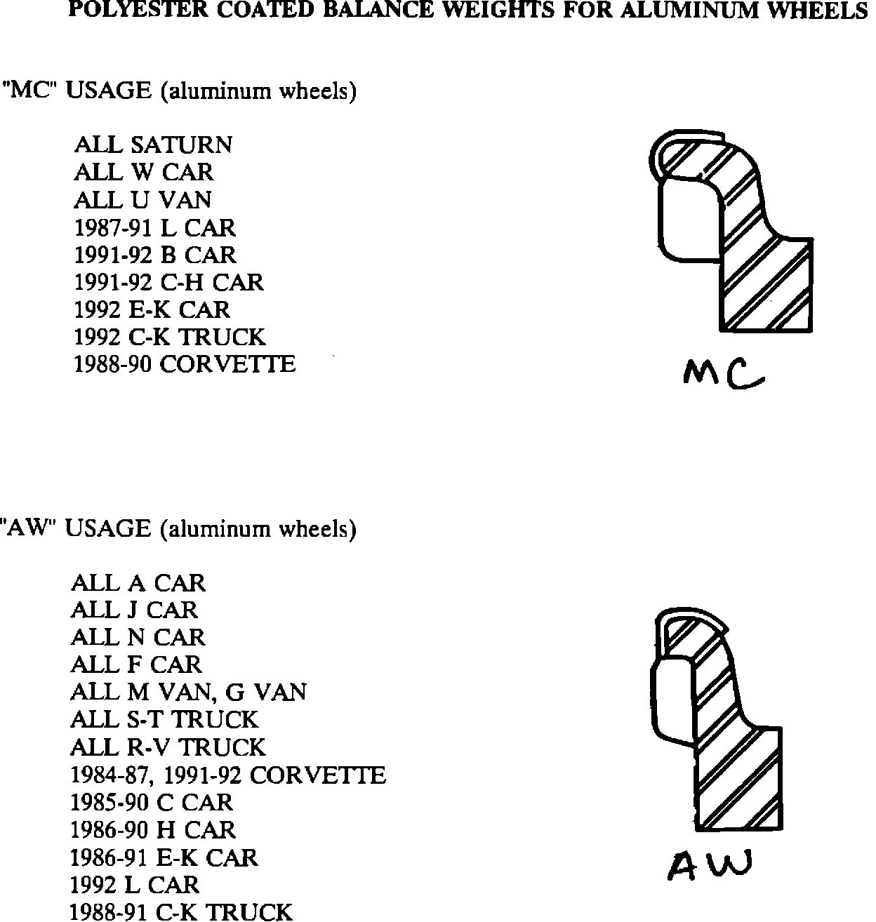 Wheel balance weights are now available through GM Dealer Equipment at a very attractive price. These are original equipment weights that will assure best fit to GM original equipment wheels. The AW series and MC series of polyester coated weights are offered for aluminum wheels. IT IS IMPERATIVE THAT COATED WEIGHTS BE USED ON ALUMINUM WHEELS TO PREVENT COSMETIC DAMAGE TO THE WHEEL. A plastic tipped hammer should also be used to prevent damage to the weight's coating during installation.