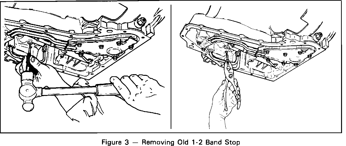 1. Using a punch and hammer, tap the black plastic adjusting tab into the 1-2 band stop assembly just enough so the stop can be removed with pliers (Figure 3).
