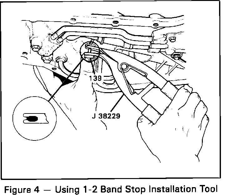 The 1-2 band stop installation tool J 38229 will be available later in the 1989 calendar year from Kent-Moore. Order the tool from Kent-Moore's Order Department at (313) 574-2332 or 1-800-345-2233.