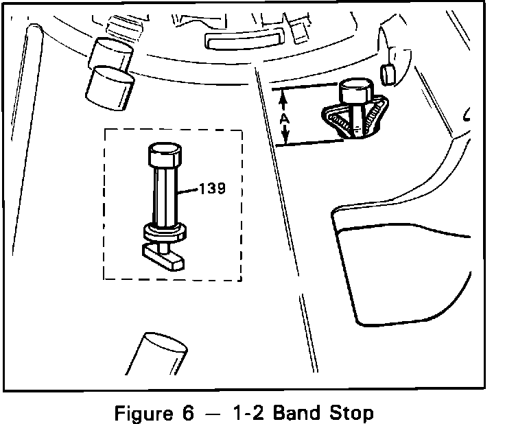 The 1-2 band stop height can be checked during an overhaul. With the transaxle disassembled, the 1-2 band stop must protrude 14 mm (9/16") through the case. (Figure 6)