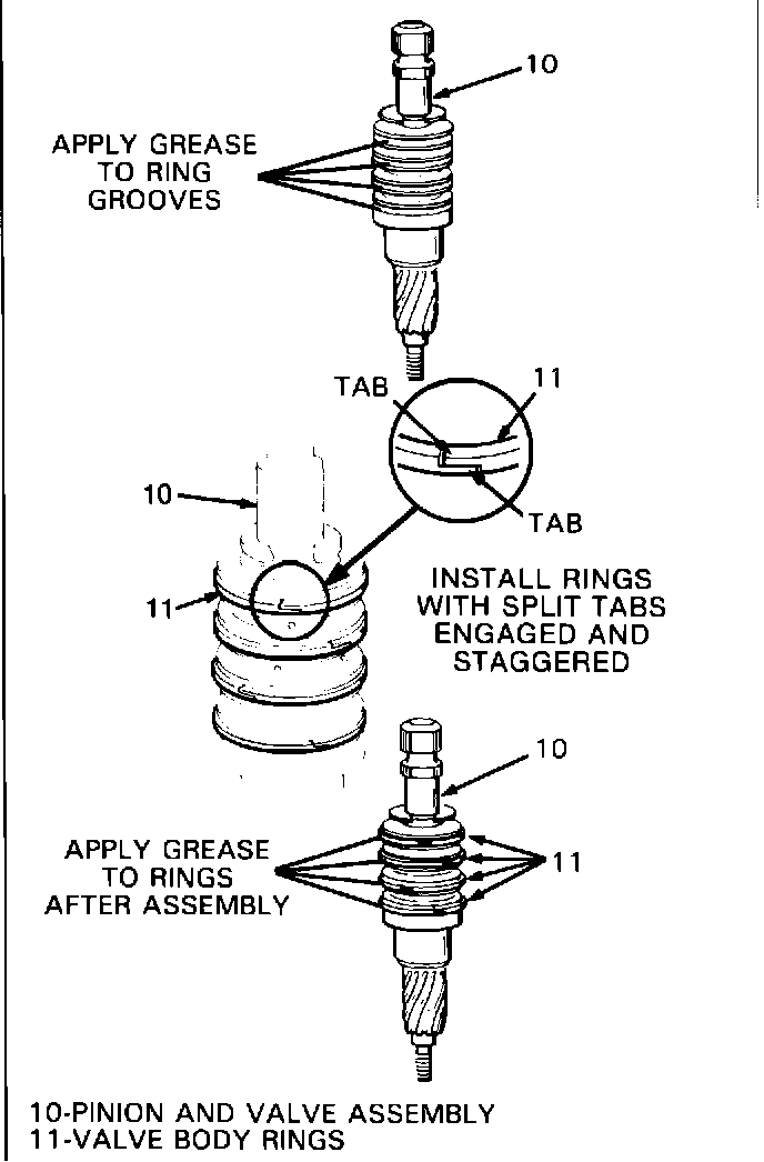 1. Install new valve body rings to pinion and valve assembly. (Care must be taken not to cut rings at installation.)