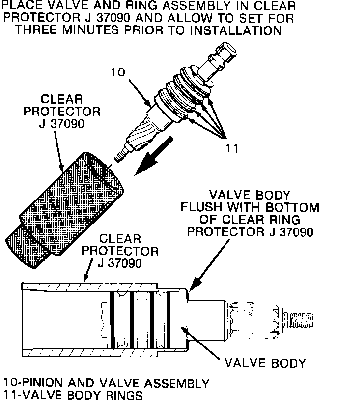 2. Place pinion and valve assembly into clear pinion and valve assembly ring protector J 37090. (Be sure to use only the clear protector.) Allow to set for approximately three minutes while continuing installation preparation. This allows the valve rings to be properly sized.