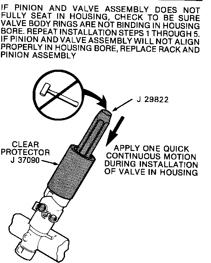 Set pinion and valve assembly onto housing using J 37090. Use J 29822 pinion seal installer to push assembly into housing bore. DO NOT hammer or use excessive force. If pinion and valve assembly does not fully seat in housing, check to be sure valve body rings are not binding in housing bore. Check rings for cuts or damage. Repeat installation steps 1 through 5. If pinion and valve assembly will not align properly in housing bore, replace rack and pinion assembly.
