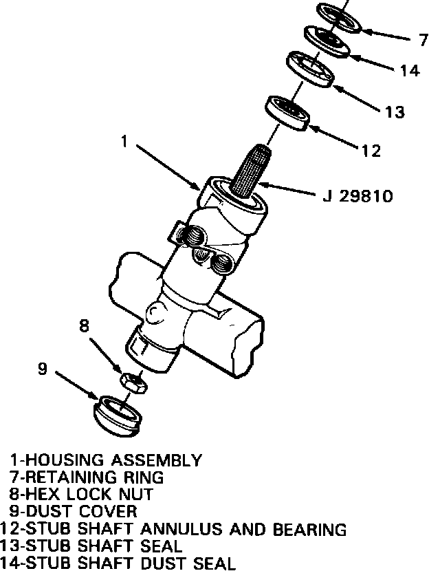 11. Install stub shaft seal and stub shaft dust seal over protector and into housing. (Apply a small quantity of grease between seals and on top of dust seal.)