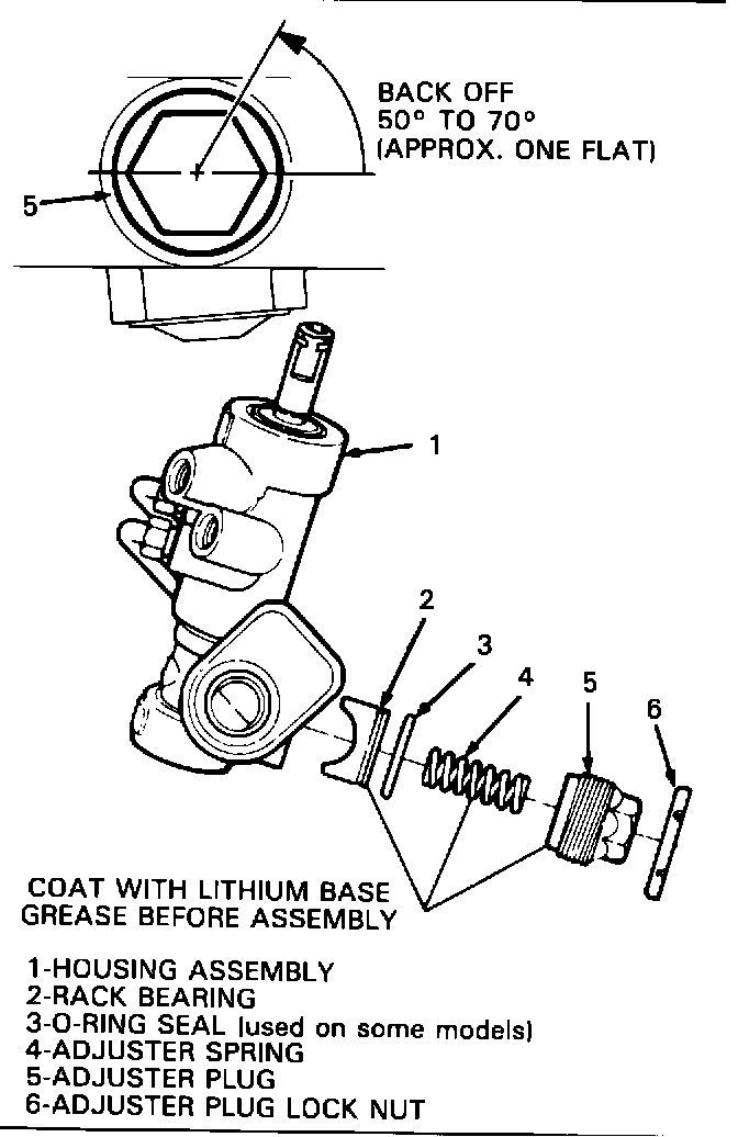 With rack centered in the housing, turn adjuster plug clockwise until it bottoms in the housing, then back off 50~ to 70~ (approx. one flat). Check torque on pinion. Maximum pinion preload torque is 1.8 N-m (16 Lbs.In.).