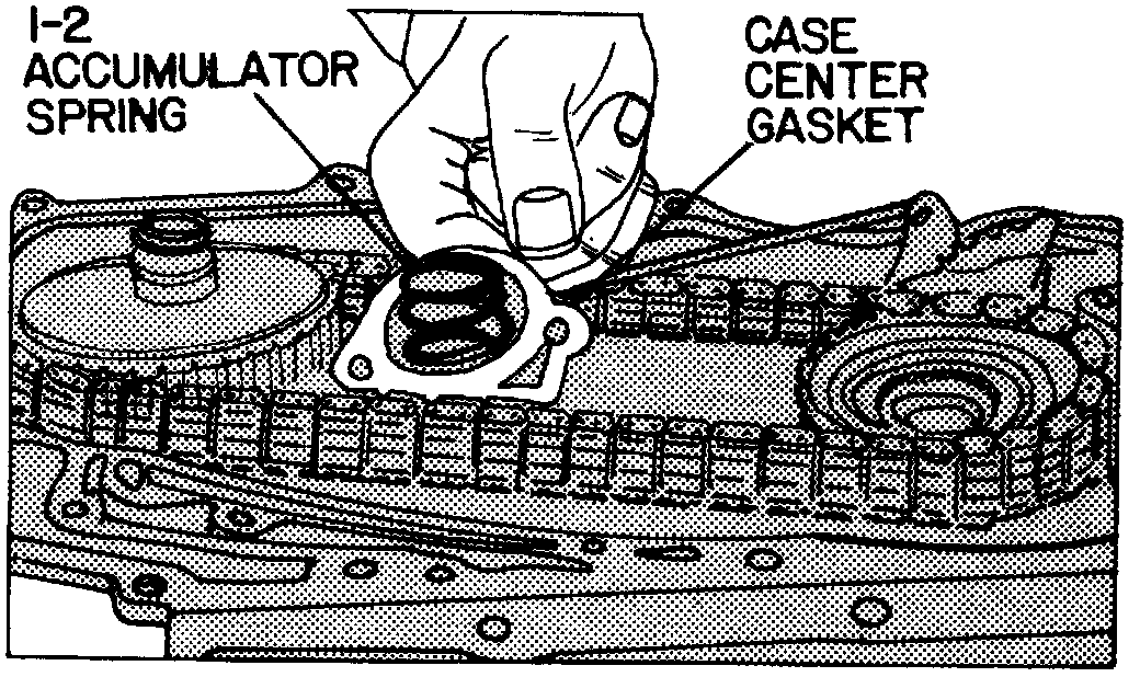 14. Install 1-2 accumulator spring and center case to case cover gasket. Retain gasket with petroleum jelly, see image.