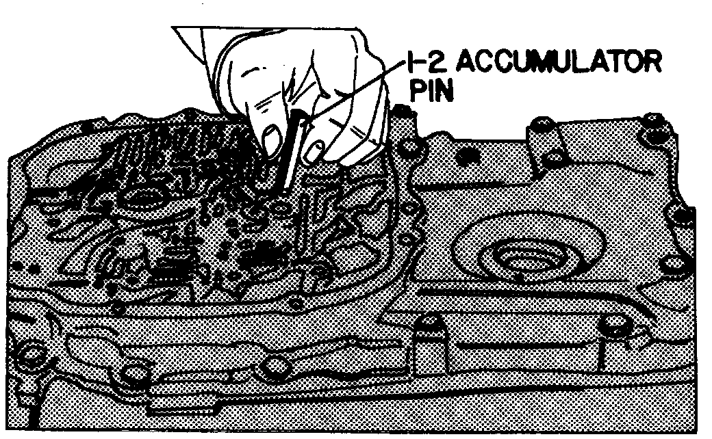 8. Remove 1-2 accumulator piston and pin. Check for wear or damage.