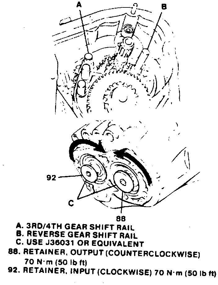 (86 and 93) are completely seated. Push rails (A and B) to engage and secure transaxle in 4th and reverse gears.
