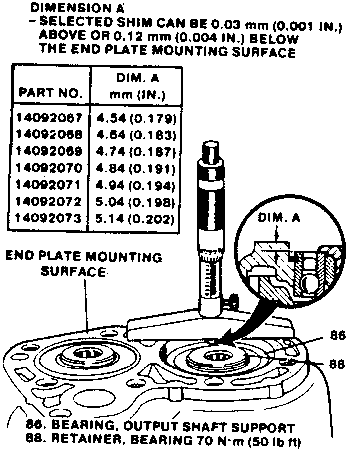 A suitable dial depth gauge or equivalent is required to conduct the following procedure. Also, ensure output bearing (86) is completely seated in its bore. Ensure bearing retainer (88) is properly torqued. A selected shim can be 0.001 inch above or 0.004 inch below the end plate mounting surface.