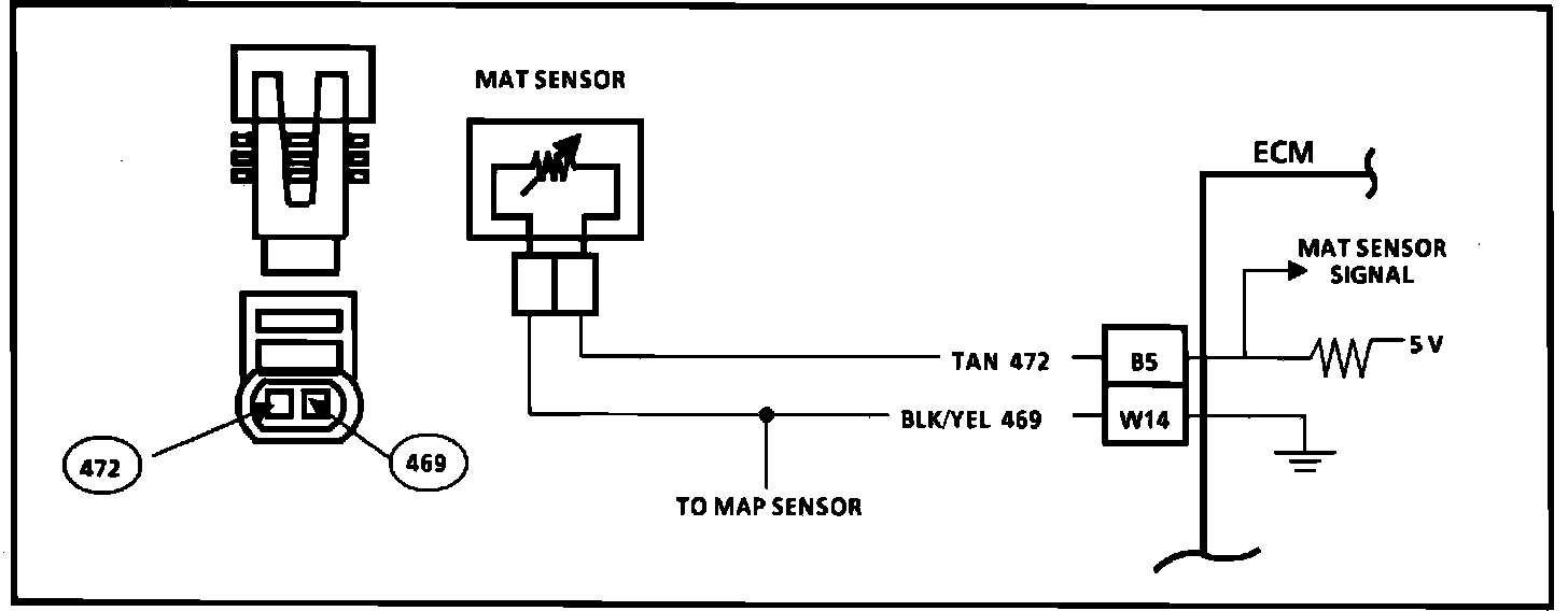 Circuit Description: The Manifold Air Temperature Sensor uses a thermistor to control the signal voltage to the ECM. The ECM applies a voltage (4-6 volts) on CKT 472 to the sensor. When manifold air is cold, the sensor (thermistor) resistance is high, therefore, the ECM will see a high signal voltage. As the air warms, the sensor resistance becomes less and the voltage drops.