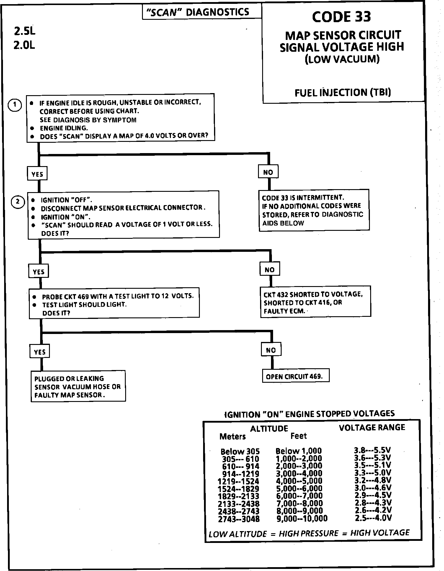 A Code 33 will result if CKT 469 is open, or if CKT 432 is shorted to voltage or to CKT 416.