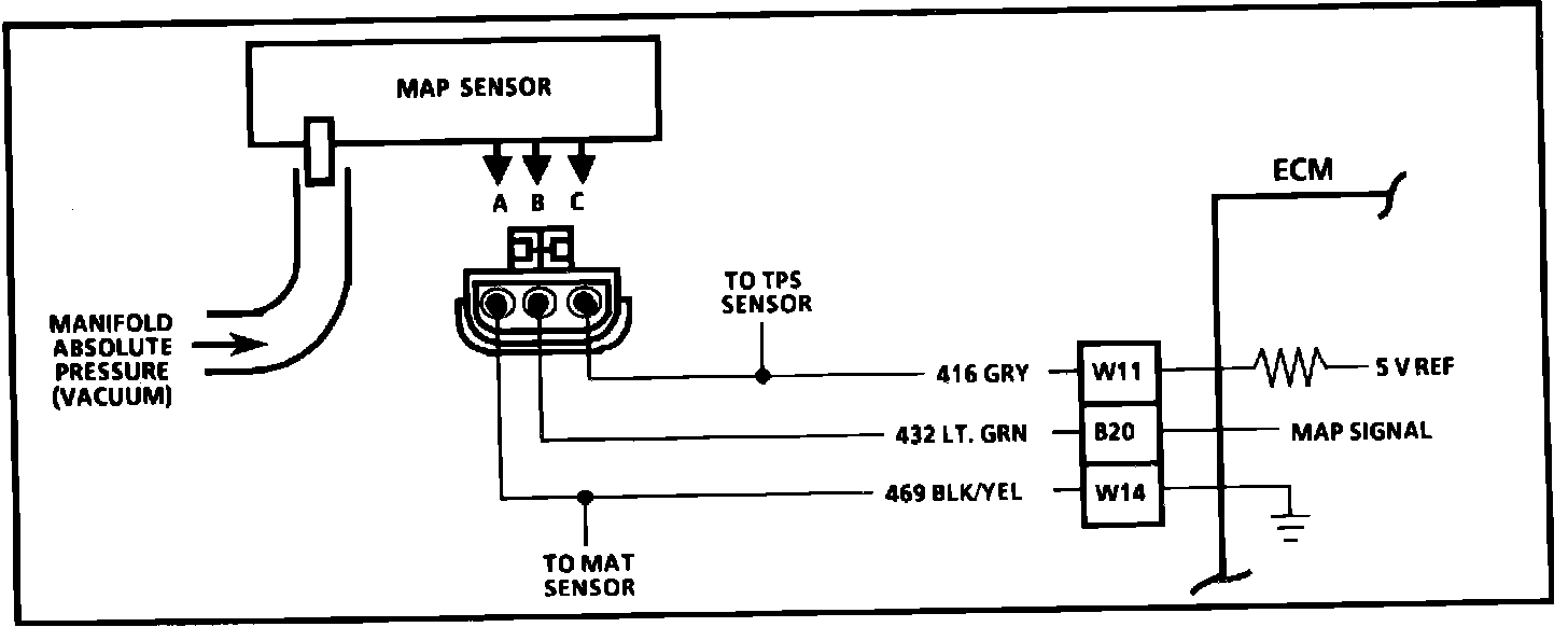 Circuit Description: The Manifold Absolute Pressure Sensor (MAP) responds to changes in manifold pressure (vacuum). The ECM receives this information as a signal voltage that will vary from about 1 to 1.5 volts, at closed throttle idle, to 4 4.5 volts at wide open throttle (low vacuum).