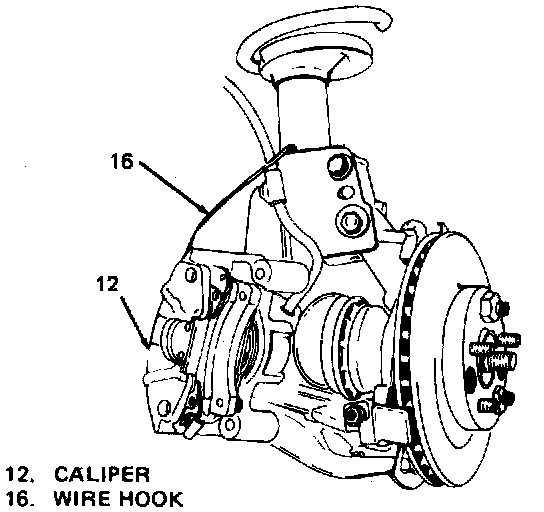 6. Remove caliper assembly from disc. If only shoe and lining assemblies are to be replaced, using a length of wire suspend caliper from spring coil.