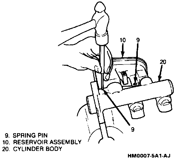 2. Install reservoir onto master cylinder body by pressing straight down, then drive in spring pins to retain resovoir.