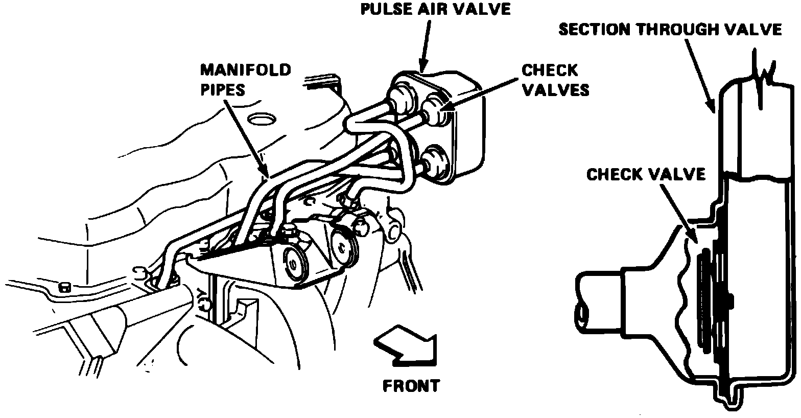 This system uses a series of pipes and check valves in the pulse air valve to route fresh air into the exhaust manifold, Fig. 18.