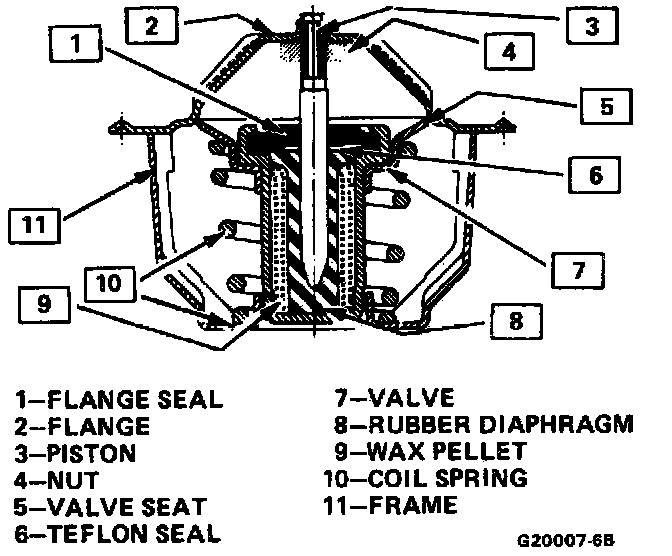A pellet-type thermostat is used in the coolant outlet passage to control the flow of coolant. It provides faster engine warmup and regulates coolant temperatures. A wax pellet or power element in the thermostat expands when heated and contracts when cooled. The pellet is connected by a piston to a metal valve. When the pellet is heated, pressure against the valve forces it to open. As the pellet cools, contraction allows a spring to close the valve. Thus, the valve remains closed while the coolant is cold; this prevents coolant circulation through the radiator, but allows the coolant to circulate through the engine to warm it quickly and evenly.