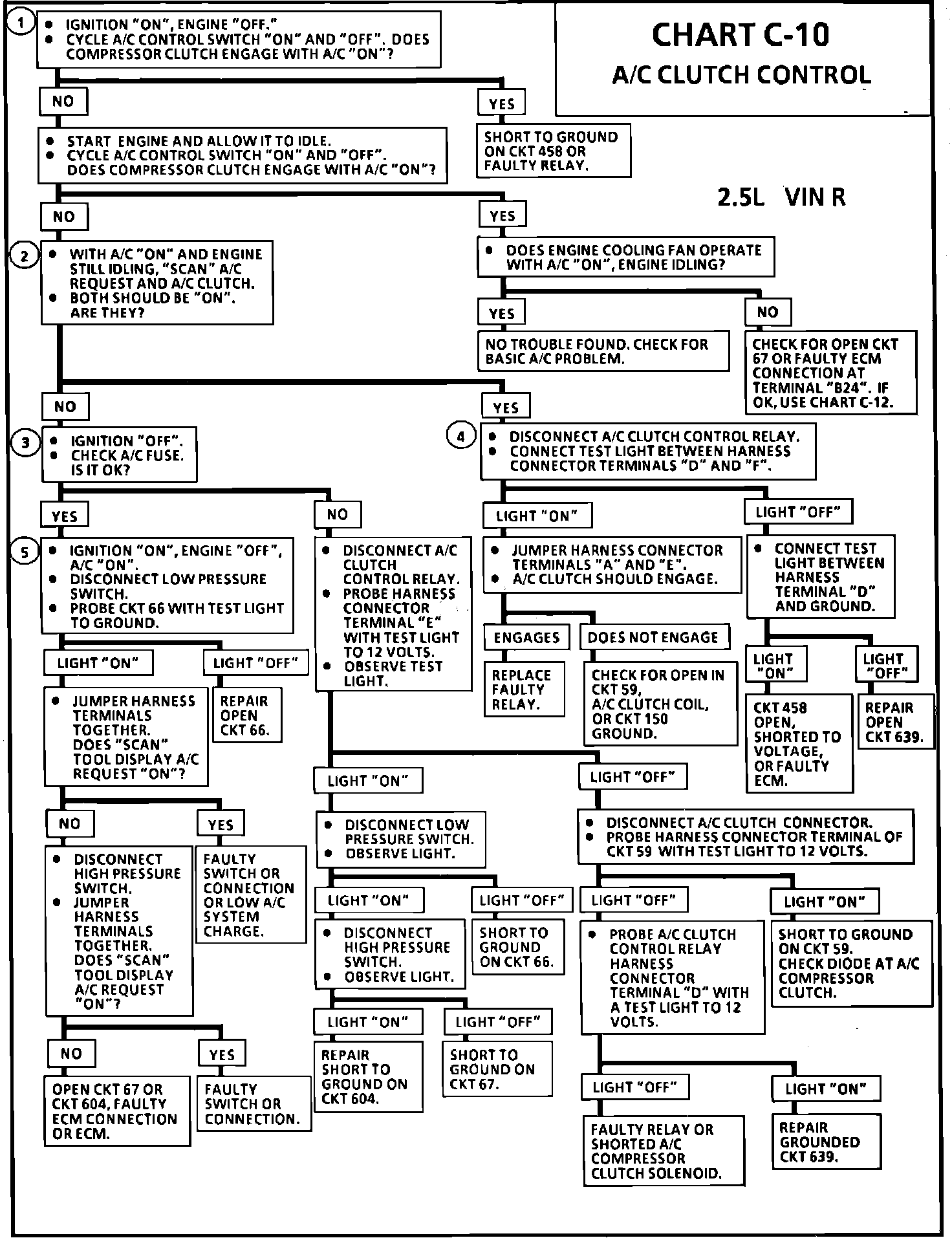 Circuit Description: When an A/C Mode is selected on the A/C control switch, ignition voltage is supplied to the compressor low pressure switch. If there is sufficient A/C refrigerant charge, the low pressure switch will be closed and complete the CKT to the closed high pressure cut-off switch and to CKTs 67 and 604. The voltage on CKT 604 to the ECM is shown be the "Scan" tool as A/C request "ON" (voltage present), "OFF" (no voltage). When a request for A/C is seen by the ECM, the ECM will ground CKT 458 and engage the A/C compressor clutch. A "Scan" tool will show the grounding, or CKT 458, as A/C clutch "ON". If voltage is seen by the ECM on CKT 67, the cooling fan will be turned on.