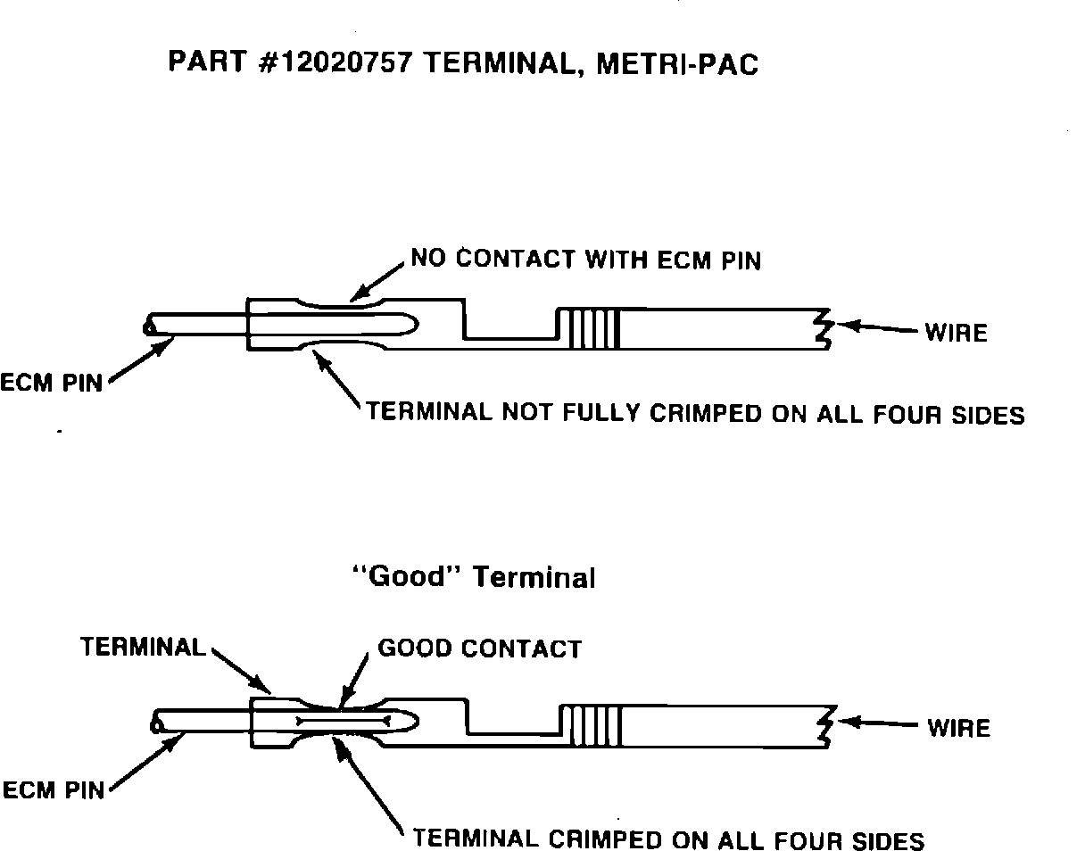 A condition may exist in which the female terminals in the connector to the ECM do not make a solid connection to the male pins in the ECM (See Illustration). This can result in an intermittent condition, in any circuit operated by the ECM. The Service Manuals direct a check of connections any time an intermittent condition is found, and this may be the cause of some of these conditions.