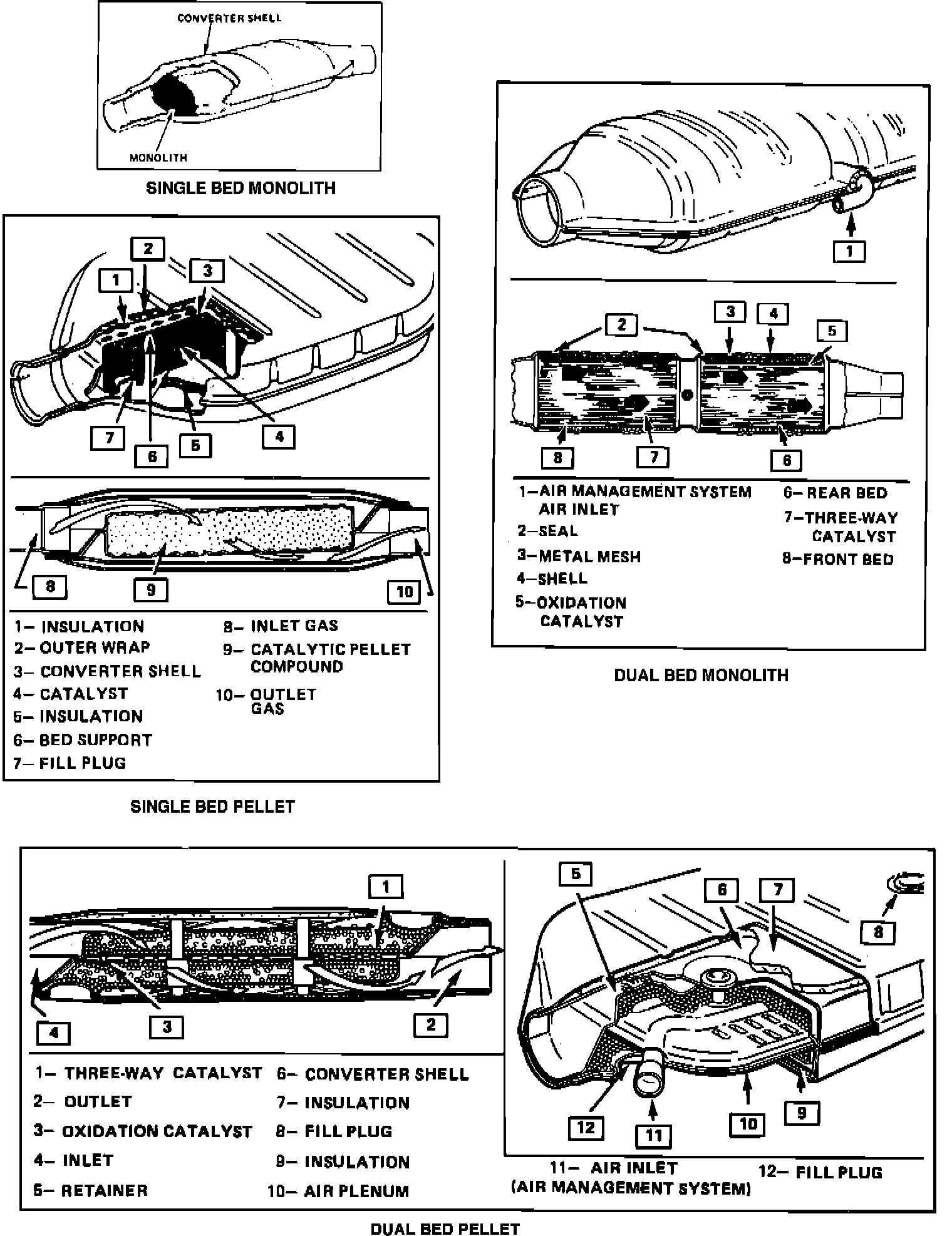 All dual bed converters, whether monolith or pellet type, contain both oxidation and three-way catalysts.
