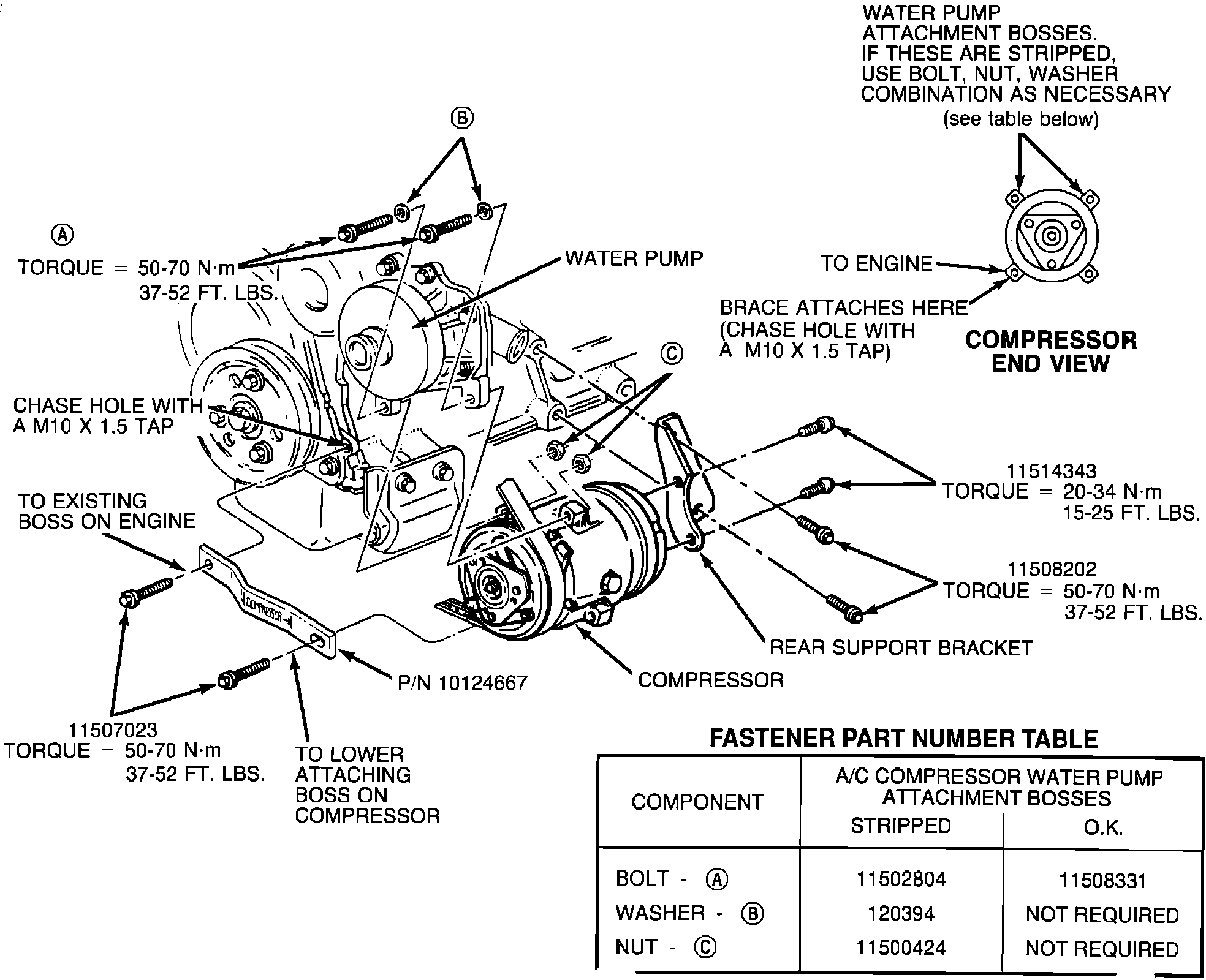 IMPORTANT: Inspect the threads of the A/C compressor's water pump attachment bosses. If damage is evident or if the bolts cannot be torqued to the specification given, then the compressor should be fastened to the water pump using the following parts: