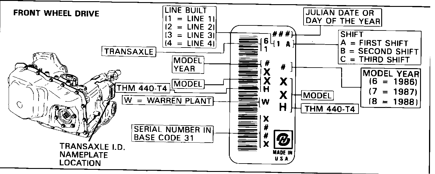 FIGURE 1 - THM 440-T4 TRANSAXLE IDENTIFICATION INFORMATION: