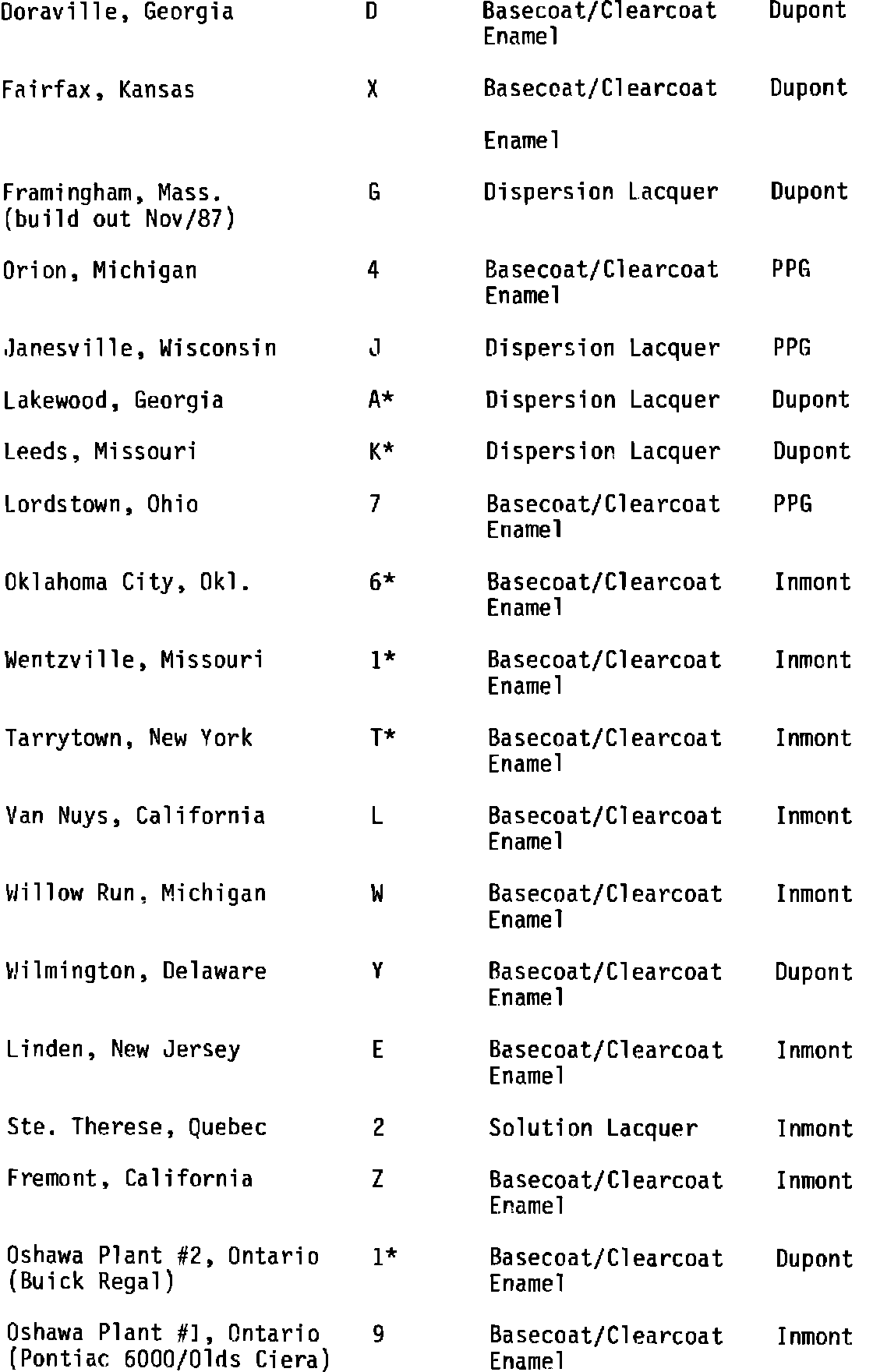 Attached is a current listing of the various assembly plants and their paint supplier. It should be noted however, that paint suppliers are subject to change at any given time.