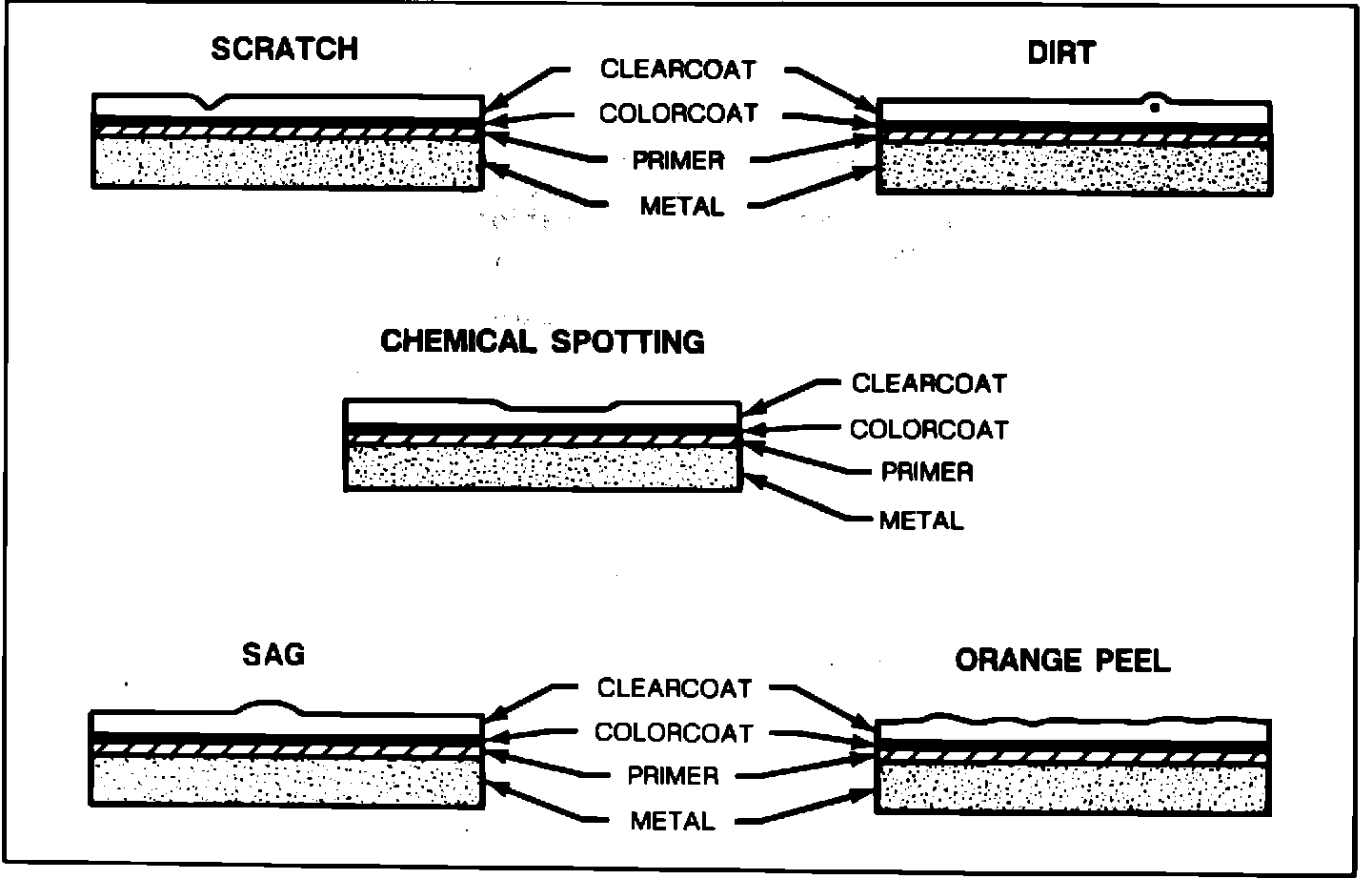 Chemical spotting, along with other minor paint imperfections on basecoat/clearcoat finishes such, as sand scratches, dirt in paint, sags and orange peel, can be repaired without paint application. Examples of these imperfections are shown in Figure 1.