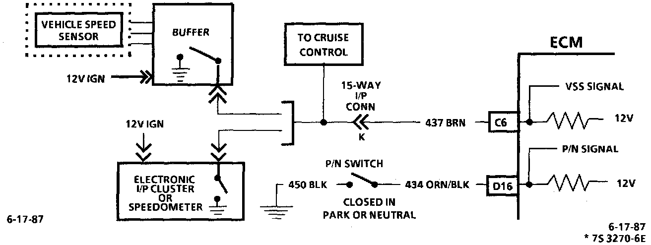 The Electronic Control Module (ECM) applies and monitors 12 volts on Circuit (CKT) 437. CKT 437 connects to the vehicle speed sensor, which alternately grounds CKT 437 when drive wheels are turning. This pulsing action takes place about 2000 times per mile, and the ECM will calculate vehicle speed based on the time between "pulses."