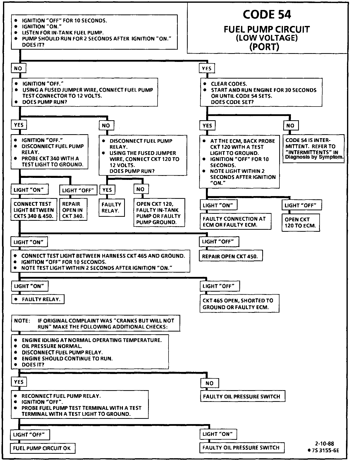 Code 54 will set if the voltage at terminal "E13" is less than 4 volts for 0.4 seconds since the last reference pulse was received. This code is designed to detect a faulty relay, causing extended crank time, and the code will help the diagnosis of an engine that "Cranks But Will Not Run."