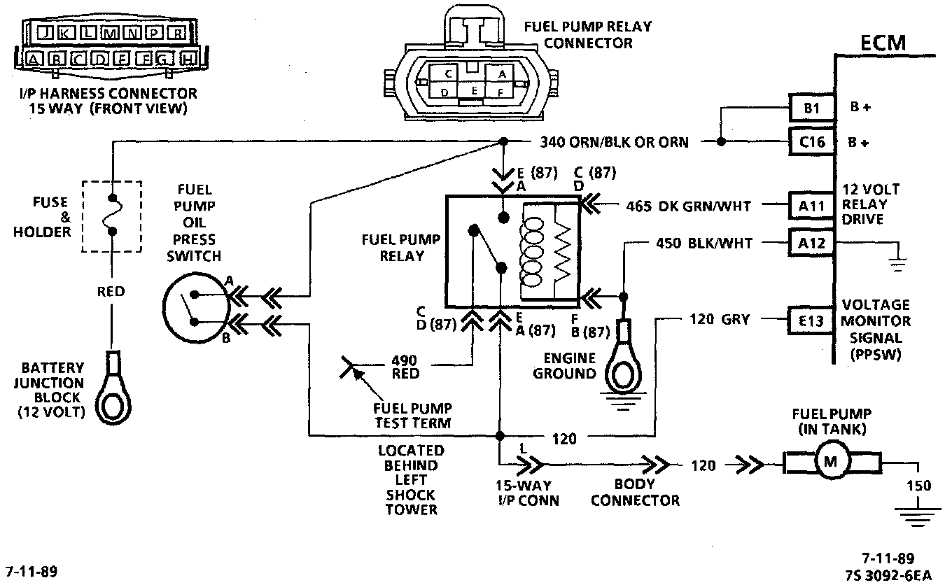 The status of the fuel pump Circuit (CKT) 120 is monitored by the Electronic Control Module (ECM) at terminal "E13" and is used to compensate fuel delivery based on system voltage. This signal is also used to store a trouble code if the fuel pump relay is defective or fuel pump voltage is lost while the engine is running. There should be about 12 volts on CKT 120 for 2 seconds after the ignition is turned or any time references pulses are being received by the ECM.