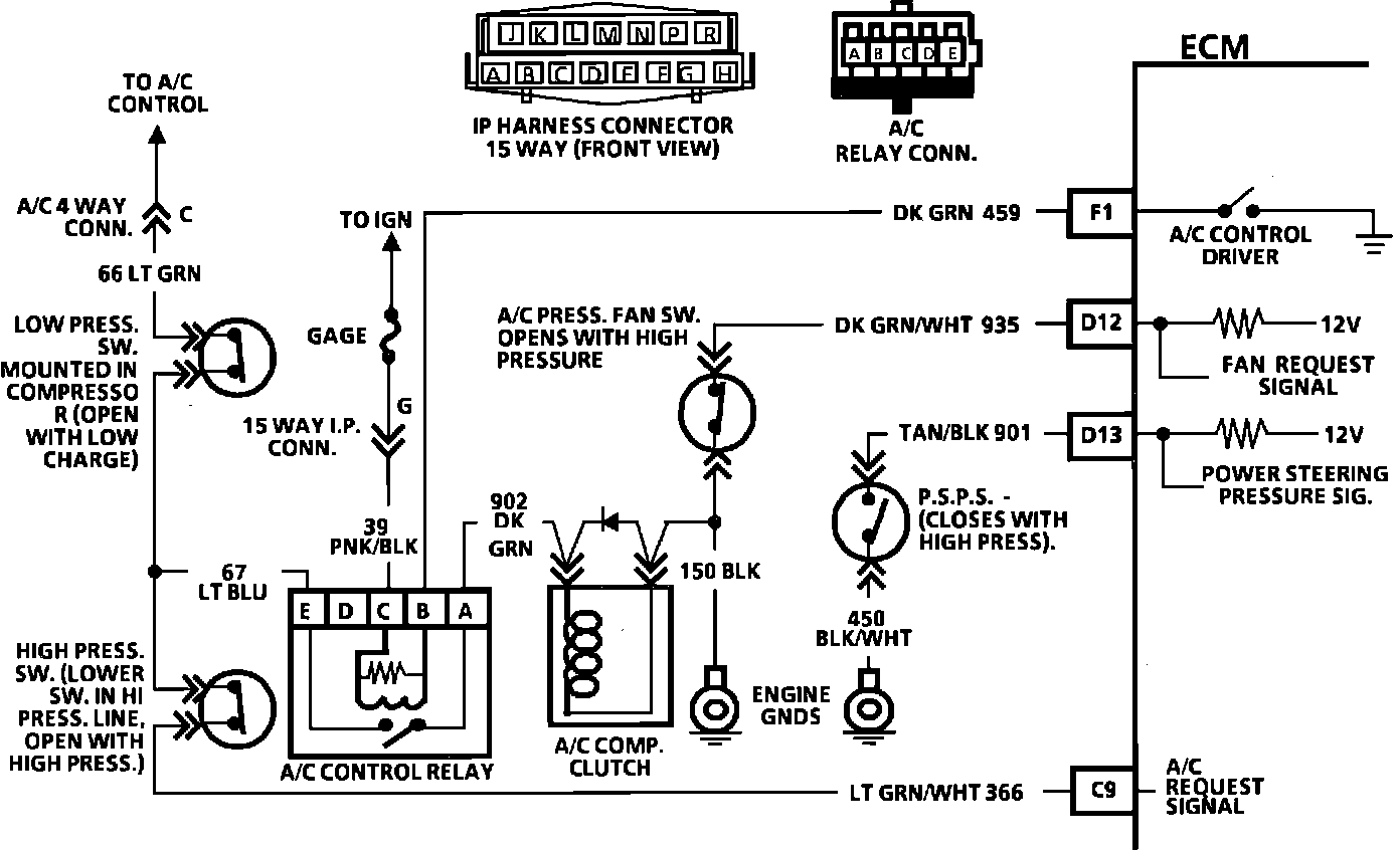 The A/C clutch control relay is ECM controlled to delay A/C clutch engagement about .4 second after A/C is turned "ON". This allows the IAC to adjust engine rpm, before the A/C clutch engages. The ECM also causes the relay to disengage the A/C clutch during WOT, when high power steering pressure is present, or if engine is overheating. The A/C clutch control relay is energized when the ECM provides a ground path for CKT 459. The low pressure switch will open if A/C pressure is less than 40 psi (276 kPa). The high pressure switch will open if A/C pressure exceeds about 440 psi (3034 kPa). The A/C pressure fan switch opens when A/C pressure exceeds about 200 psi (1380 kPa).