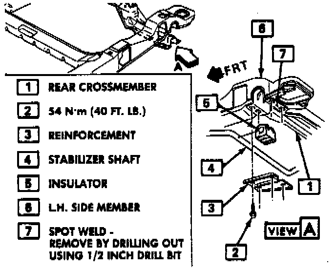15. On 1988 models, drill through spot weld located between rear holes of left front stabilizer bar rear holes of left front stabilizer bar mounting, Fig. 3, using 1/2 inch bit.